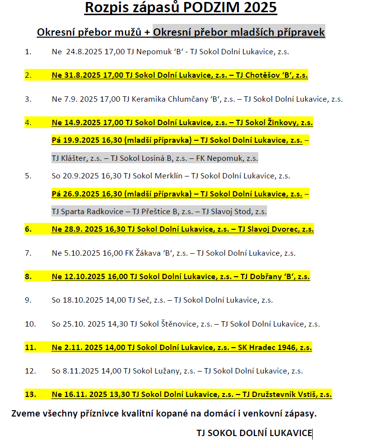 Rozpis zápasů PODZIM 2025 Zveme všechny příznivce kvalitní kopané na domácí i venkovní zápasy. TJ SOKOL DOLNÍ LUKAVICE