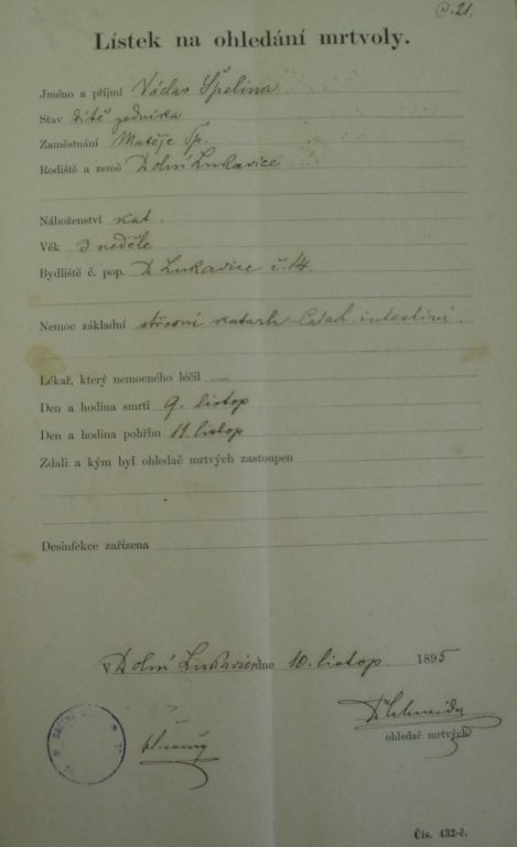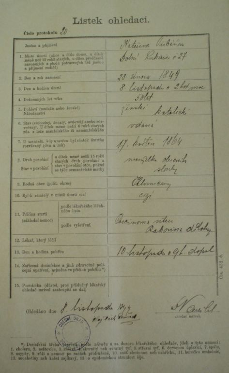 Když někdo zemřel, byl přivolán lékař, který sepsal lístek na ohledání mrtvoly (nebo tzv. lístek ohledací, lístek umrlčí). Na tomto lístku byla uvedena přesná hodina, minuta smrti a také přesný čas pohřbu. (Pohřeb se zpravidla konal za dva dny.) Tyto lístky byly uchovávány na každé farnosti. I pohřeb probíhal jinak než dříve. S rakví nejezdilo auto, nýbrž tzv. „umrlčí kočár“, se kterým jezdil pan Milota z Horní Lukavice