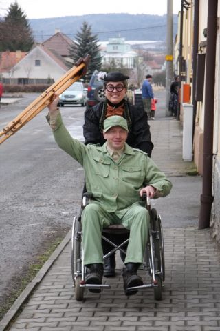 Starosta obce v úloze „šerifa“ předal strašidlu Peprníkovi /místostarostka obce/ klíče od všech obcí. A průvod se dal do pohybu. K hrstce nejvěrnějších „starých maškar“, které v průvodu ještě nikdy nechyběly, se přidalo i pár nováčků - dokonalá čarodějnice a paní Müllerová, která tlačila na vozíku dobrého vojáka Švejka. Josef Švejk a jeho oddaná posluhovačka se stali hvězdami letošního masopustu! Na složení masopustního průvodu se stejným dílem podílely Snopoušovy, Lišice a Dolní Lukavice. Celkem tedy 29 masek v originálních kostýmech předvádělo svůj um, vtip a fantazii. A tak se v průvodu vznášely dvě medúzy, hejno strašidel, bílá paní, upírka, uklízečky a deratizátor prováděli jarní úklid, zvířata se honila, opraváři „opravovali“ batole XXXXL zkoušelo první vratké krůčky, nechyběl čert, ohnivák, rozkošný dráček Soptík nebo kat. Švejk se pilně mazal opodeldokem, takže byl schopen nejen boje, ale i tance na každém zastavení . Kohout zlobně kykyrikal a nedůtklivě rozhraboval běhákem hromádky štěrku či starého sněhu . Uklízečky rychle počistily a kohout se pochlubil „vlastnoručně“ snešeným vajíčkem a na závěr „obšťastnil„ paní domu. Škoda jen, že oblíbená maska „šik stará dáma“ letos navštívila jen Dolní Lukavici, protože nemohla pokračovat v obchůzce pro společenské faux-pax . Na Pajzovně z ní spadla sukně…