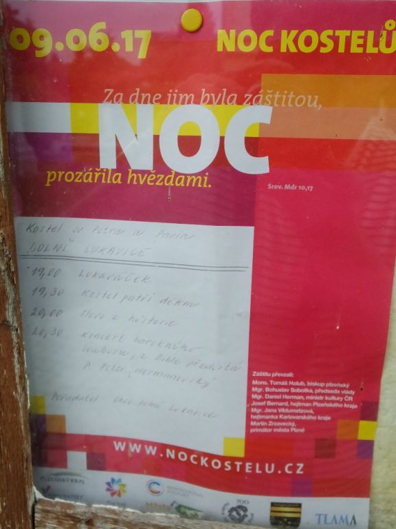 Podařilo se nám zapojit se do celostátní Noci kostelů. V okolí Plzně se do tohoto projektu zapojilo 20 kostelů, z našeho nejbližšího okolí např. Vícov, Skočice, Dobřany, Letiny. Akce byla pořádána pod záštitou Mons. Tomáše Holuba, plzeňského biskupa. Program v našem kostele sv. Petra a Pavla byl postupně sestavován již během března a dubna, neboť do konce dubna musel být kostel elektronicky přihlášen. S panem farářem jsme se rozhodli do této akce zapojit také žáky z lukavické základní školy, které jsme osobně 26. dubna pozvali a 10. května je pan farář provedl po kostele, aby se mohli inspirovat ke svým pracím. Děti poté psaly a kreslily pod dohledem učitelů. Během cca měsíce vznikaly krásné výtvarné a literární práce, z nichž ocenit tři nejlepší rozhodně nebylo lehké. Nakonec jsme odměnili šest nejlepších bez určeného pořadí: Eliška Bauerová, Eliška Lexová, Milena Kopičková, Adam Krs, David Švajcr a Markéta Šíchová. Drobný dárek od pana faráře dostali i ti žáci, kteří se neumístili. Všichni si zaslouží velkou gratulaci! Akci v 19 hodin zahájil farář P. Peter Hermanovský a předal slovo hudebnímu souboru Lukaváček. Po zhruba půl hodinovém vystoupení následovalo vyhodnocení soutěže a předání cen. Dalším bodem programu byla soutěž pro děti tématicky zaměřená na interiér kostela. Děti soutěžily ve skupinkách a na sedmi zastaveních plnily jednotlivé úkoly. Když vše správně splnily, čekala je sladká odměna. Poté byli všichni přítomní seznámeni s historií kostela a po výkladu následoval poslední bod programu - koncert barokního souboru. Barokní soubor zahrál jak melodie od starých mistrů, tak i moderní skladby. Soubor sklidil obrovské nadšení a byl odměněn dlouhým potleskem. Tato netradiční akce přilákala hodně lidí a to nejen místních, ale i z okolí. Ráda bych poděkovala všem, kteří se na této akci podíleli. Ráda bych se s vámi rozloučila zprávou od Christopha Schönborna, vídeňského arcibiskupa, který má kořeny svého rodu právě v Dolní Lukavici: "Setkávat se a učit se od sebe navzájem – k tomu nám Noc kostelů každoročně vytváří zvláštní příležitost. Křesťané jsou jako paprsky kola, jehož středem je Ježíš: čím více se k tomuto středu přibližujeme, tím blíže se dostáváme k sobě navzájem. Přeji vám všem, aby tomu tak bylo zejména 9. června. Velmi se raduji, že i letos je v České republice otevřeno tolik kostelů..."