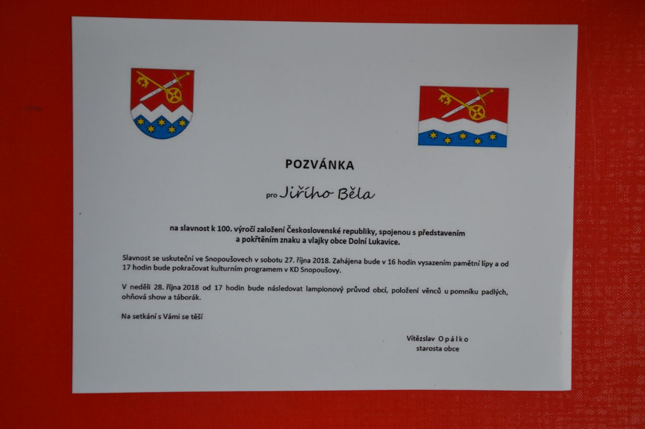 Akce začala v sobotu 27. října ve Snopoušovech, kde byla po krátkém projevu starosty obce zasazena lípa svobody. Poté se všichni přemístili do kulturního domu, kde následovalo krátké představení obecních symbolů. Hudebním vystoupením program oživili kluci Mrázovi a ve večerních hodinách taneční parket „rozparádila“ kapela Ponorka band. V neděli dopoledne pan farář P. Peter Hermanovský sloužil mši za padlé vojáky v I. světové válce. Odpoledne - po položení věnců k pomníku padlých – obcí prošel lampionový průvod, který i přes velice nepříznivé počasí přilákal mnoho rodičů s dětmi. Následovala ohnivá show, opékání buřtů a posezení s Hájenkou. K tomuto významnému jubileu Obec Dolní Lukavice vydala speciální číslo časopisu Hlasatel, kde jsou shrnuty události, které se v obci staly v posledních 100 letech. Text doplňují staré fotografie a vzpomínky pamětníků. Děkuji všem, kteří se na této akci podíleli.