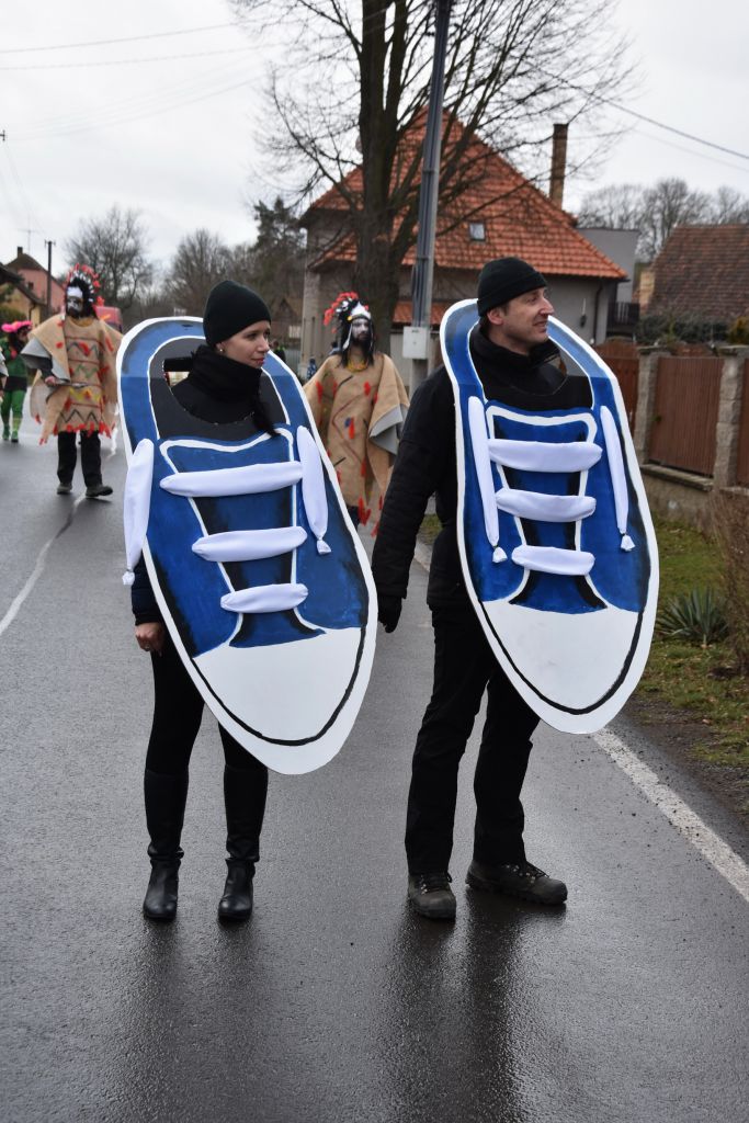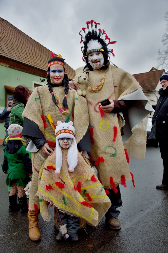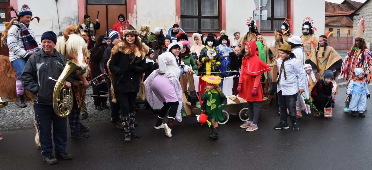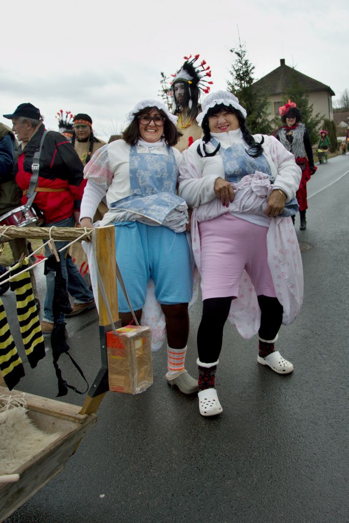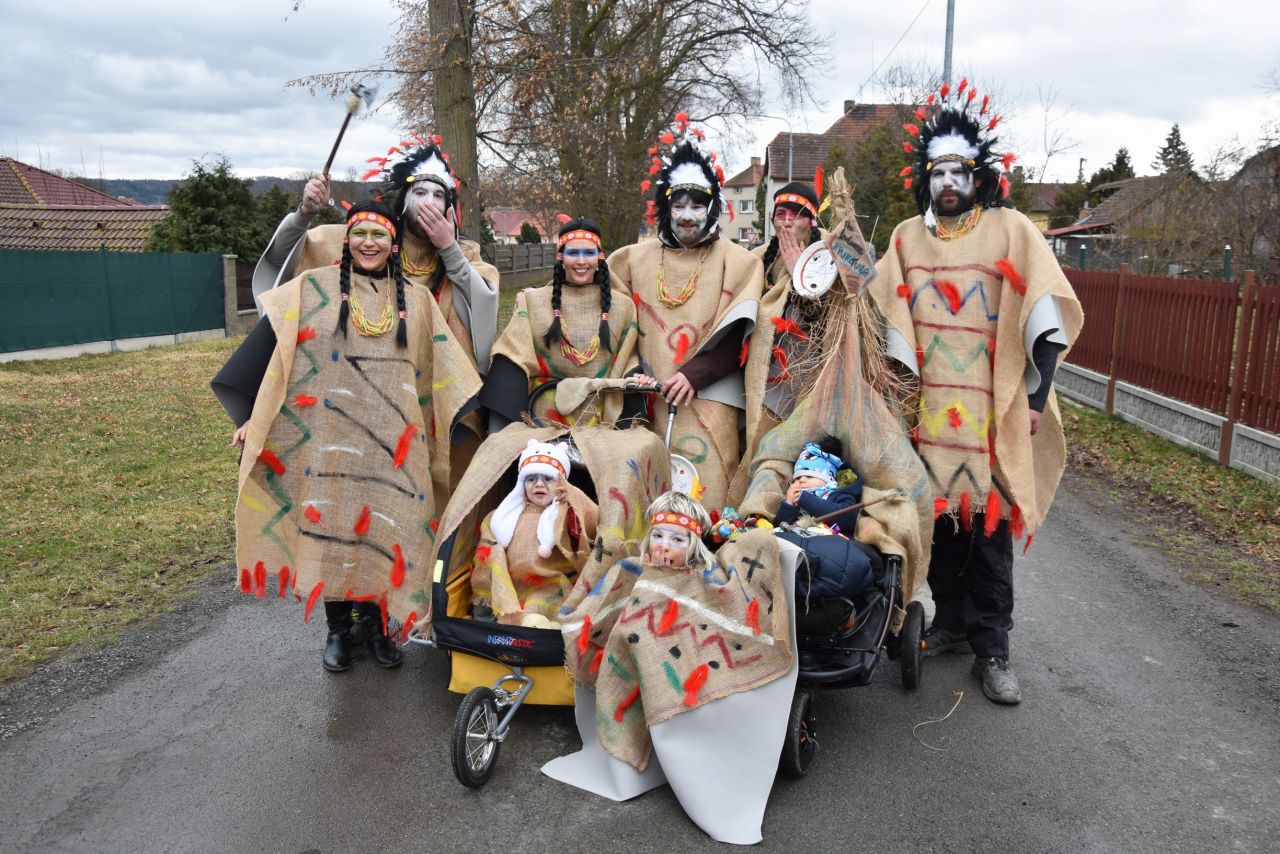 Trocha statistiky: Snad poprvé se mi nepovedlo spočítat masky, bylo jich prostě přes padesát. Nejpočetněji byla zastoupena rodina Popovic, nejstarší účastnice průvodu se patrně ukrývala pod maskou Hejkala a nejmladší maska byl roční Zdeněček Hrubý, kterého jeho indiánští rodiče vezli v teepee. Nejpočetnější společnou maskou byl indiánský kmen Hru KoTu Vla (Hrubý, Kociánová, Turkovi, Vladařovi) se dvěma pojízdnými tee-pee. Naprosto nepřehlédnutelná byla První lukavická pojízdná prádelna, jejíž majitelky neváhaly zvednout suknice a ukázat čistě vyprané bombarďáky jako vizitku své kvalitní práce (paní Boušová, Blahoutová a jako máchač a tahoun vozu pan Jarda Hrubý ).