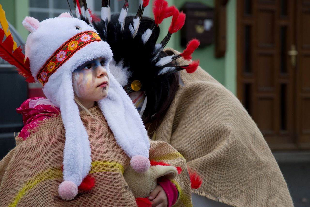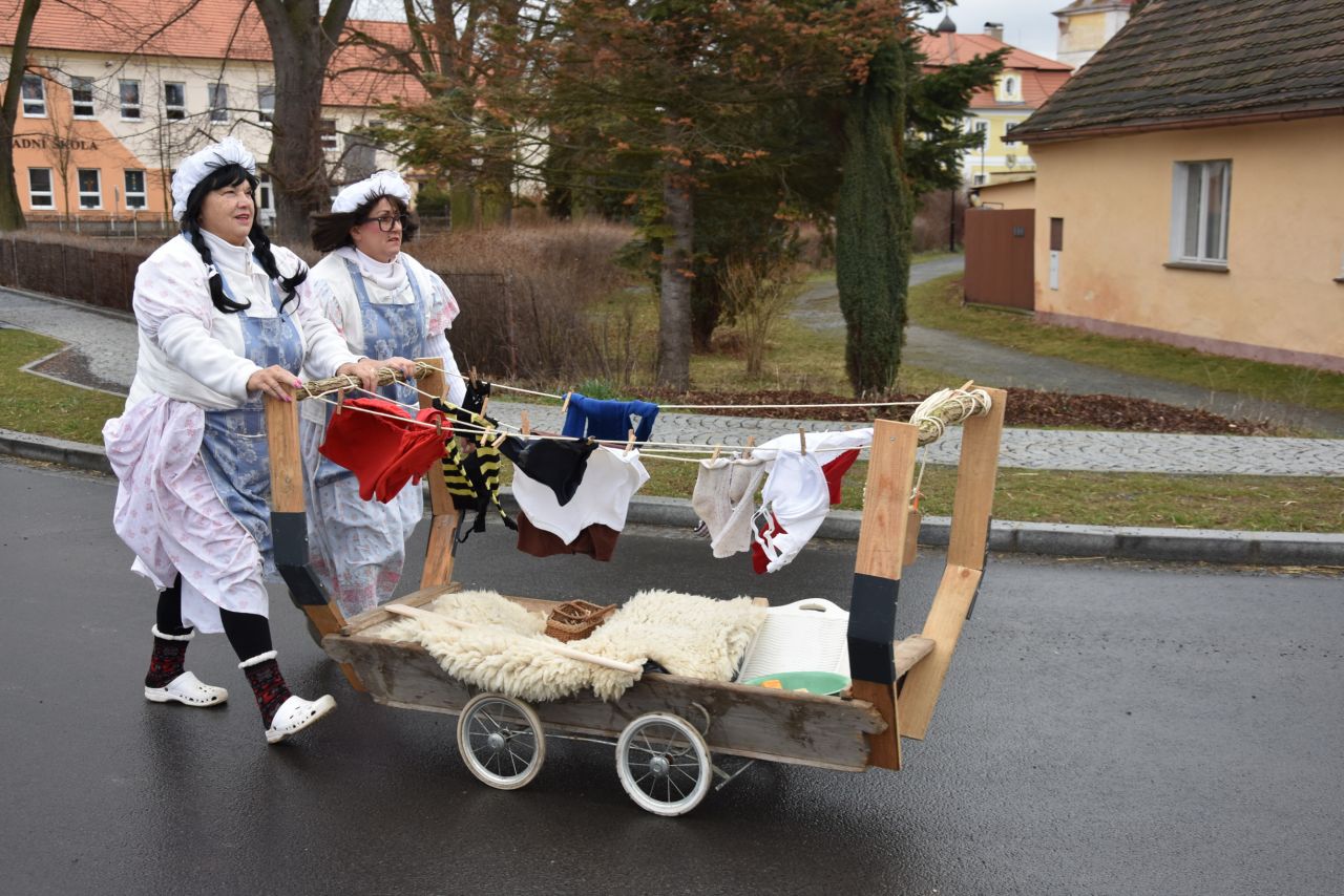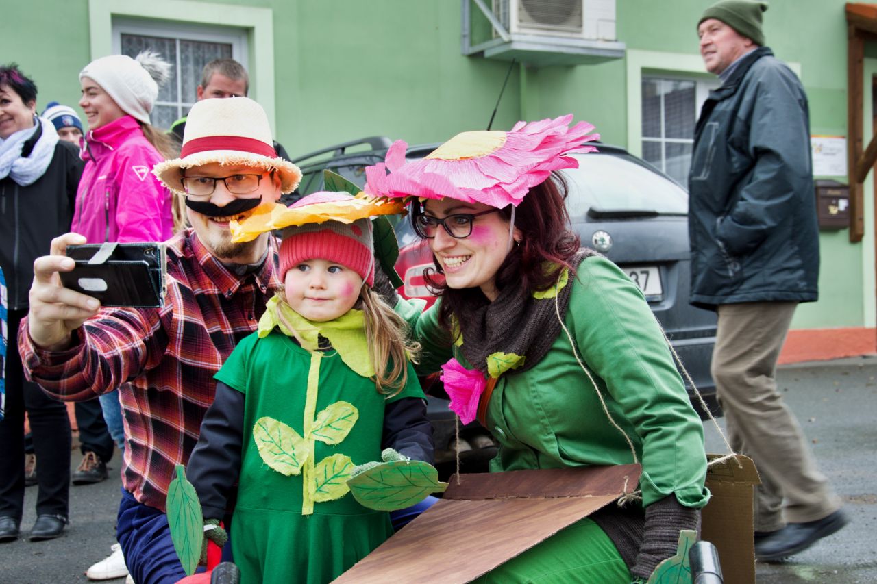 Trocha statistiky: Snad poprvé se mi nepovedlo spočítat masky, bylo jich prostě přes padesát. Nejpočetněji byla zastoupena rodina Popovic, nejstarší účastnice průvodu se patrně ukrývala pod maskou Hejkala a nejmladší maska byl roční Zdeněček Hrubý, kterého jeho indiánští rodiče vezli v teepee. Nejpočetnější společnou maskou byl indiánský kmen Hru KoTu Vla (Hrubý, Kociánová, Turkovi, Vladařovi) se dvěma pojízdnými tee-pee. Naprosto nepřehlédnutelná byla První lukavická pojízdná prádelna, jejíž majitelky neváhaly zvednout suknice a ukázat čistě vyprané bombarďáky jako vizitku své kvalitní práce (paní Boušová, Blahoutová a jako máchač a tahoun vozu pan Jarda Hrubý ).