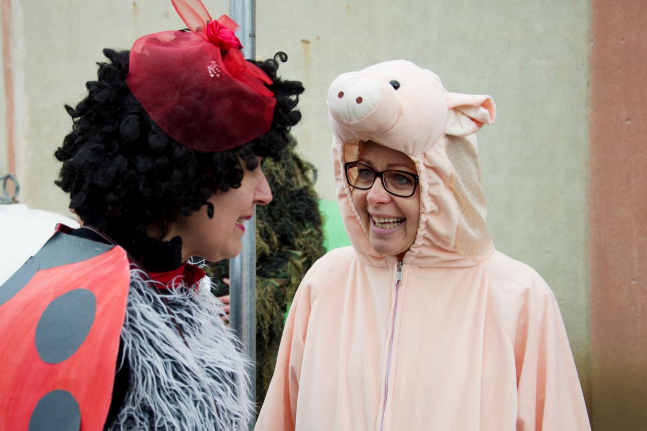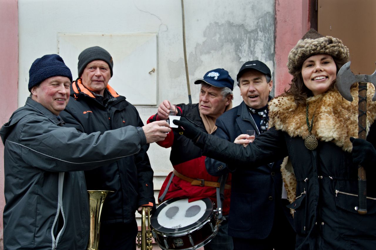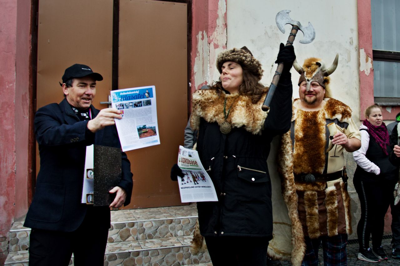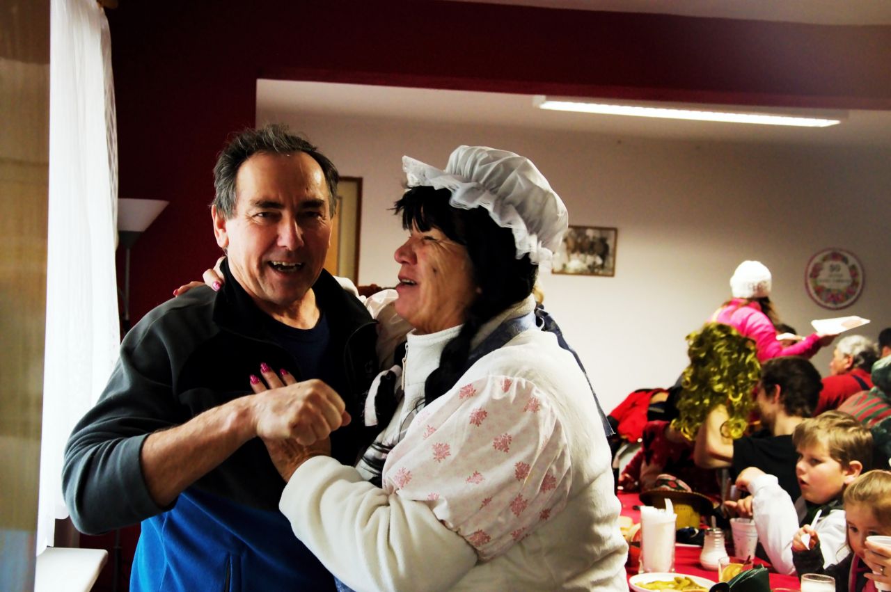 Trochu rozčarované dorazily maškary před hospodu v Lukavici a tam se připojil zbytek masek, keltští bojovníci se shledali s náčelníkem kmene a rozzlobený medvědář konečně polapil svého huňáče. Starosta vydal klíče od Obce, přidal nezbytná ponaučení a připil si s keltskou bojovnicí. Ještě oficiální foto všech masek a průvod vyšel po vsi. Řečeno sportovní terminologií: po celou dobu hrály maškary přesilovku nad diváky. Průvod doprovázelo jen několik věrných diváků, o to příjemnější bylo pak překvapení, když se na trase objevilo několik zcela nových zastávek -osvěžoven. Někde pro masky vystrojili úplnou hostinu! A tak se jedlo, pilo, zpívalo a tančilo. Všem děkujeme za všechny ty dobroty, opravdu se nechodíme na Masopust najíst (zkušené masky chodí do průvodu s pořádným "základem" z domova, aby je nezboural první přípitek, a po průvodu nám v chovateně servírují improvizovaný oběd), ale je moc milé cítit se jako milý a vítaný host.