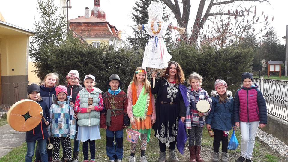 25. března jsme s dětmi vynášeli Moranu, loučili se s vládkyní Zimy a vítali Jaro a bohyni Vesnu s Jarovítem. V průvodu jsme se každý vystřídali a nesli Moranu, ostatní hráli do pochodu na bubínky či chřestili i některé maminky se přidaly, čímž jim děkuji za účast a namířili jsme k řece, kde jsme ji vhodili do vody a zamávali, hodili po ní ještě šiškami a ulitkami. Pak jsme společně přivítali Jaro, Vesnu a Jarovíta básničkou,. Jarovít předal Vesně kytičku z větviček jívy a vrby symbol jara a Vesna pak rozdala líto létečka všem, aby si jej zapíchli na svůj záhonek a dobře jim plodil. A jaro už může začít naplno. Děkuji dětem při tvoření Morany a předvedení tradice. Krásné jaro i vám všem!