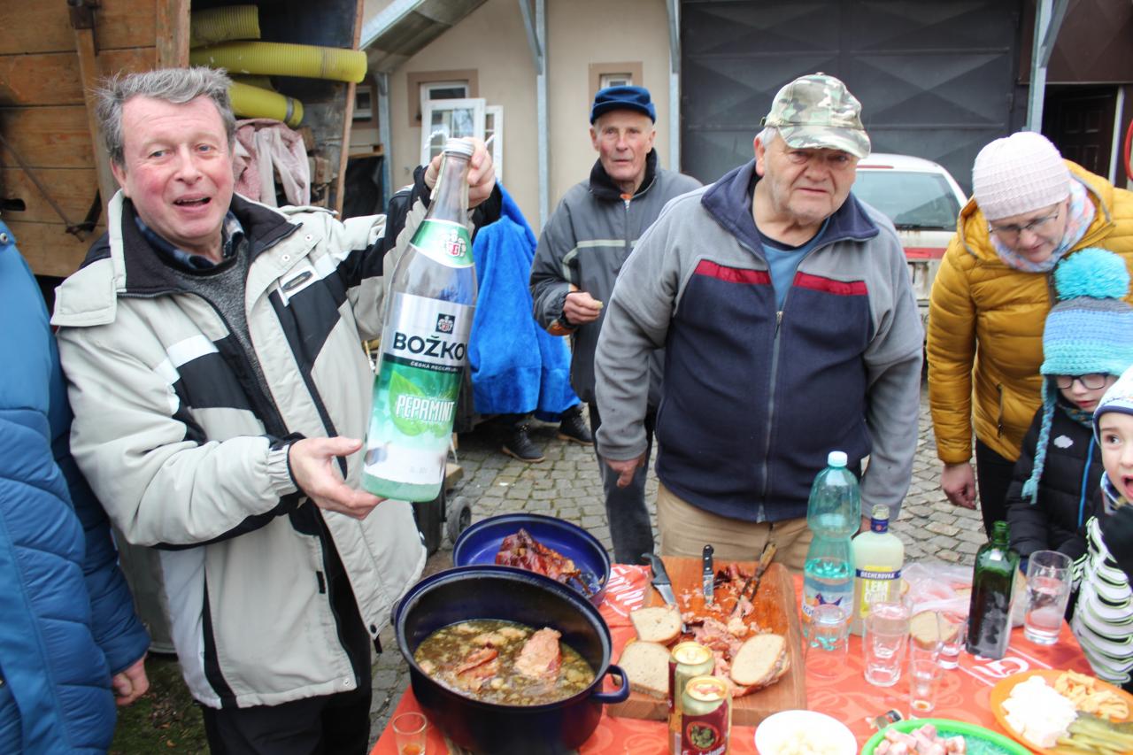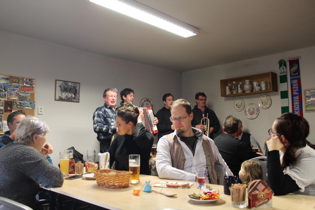 Po obvyklé obchůzce se část masek uchýlila na oběd do Chovatelny a po jídle se teprve rozproudila ta pravá masopustní zábava. Hájenka hrála, zpívala, přišlo i několik diváků a přineslo další pohoštění a záhy zpívala celá hospoda. Zvláště milým i hosty byli manželé Herbočkovi, pan Herboček, jeden z mála žijících muzikantů slavné velké Maškovy kapely se vítal nadšeně s přáteli a známými, zpíval s Hájenkou, vzpomínalo se a zpívalo. Zpívalo a zpívalo a zpívalo až do pozdního odpoledne. A ze zdi se z obrázku spokojeně usmíval pan Kvídera.
