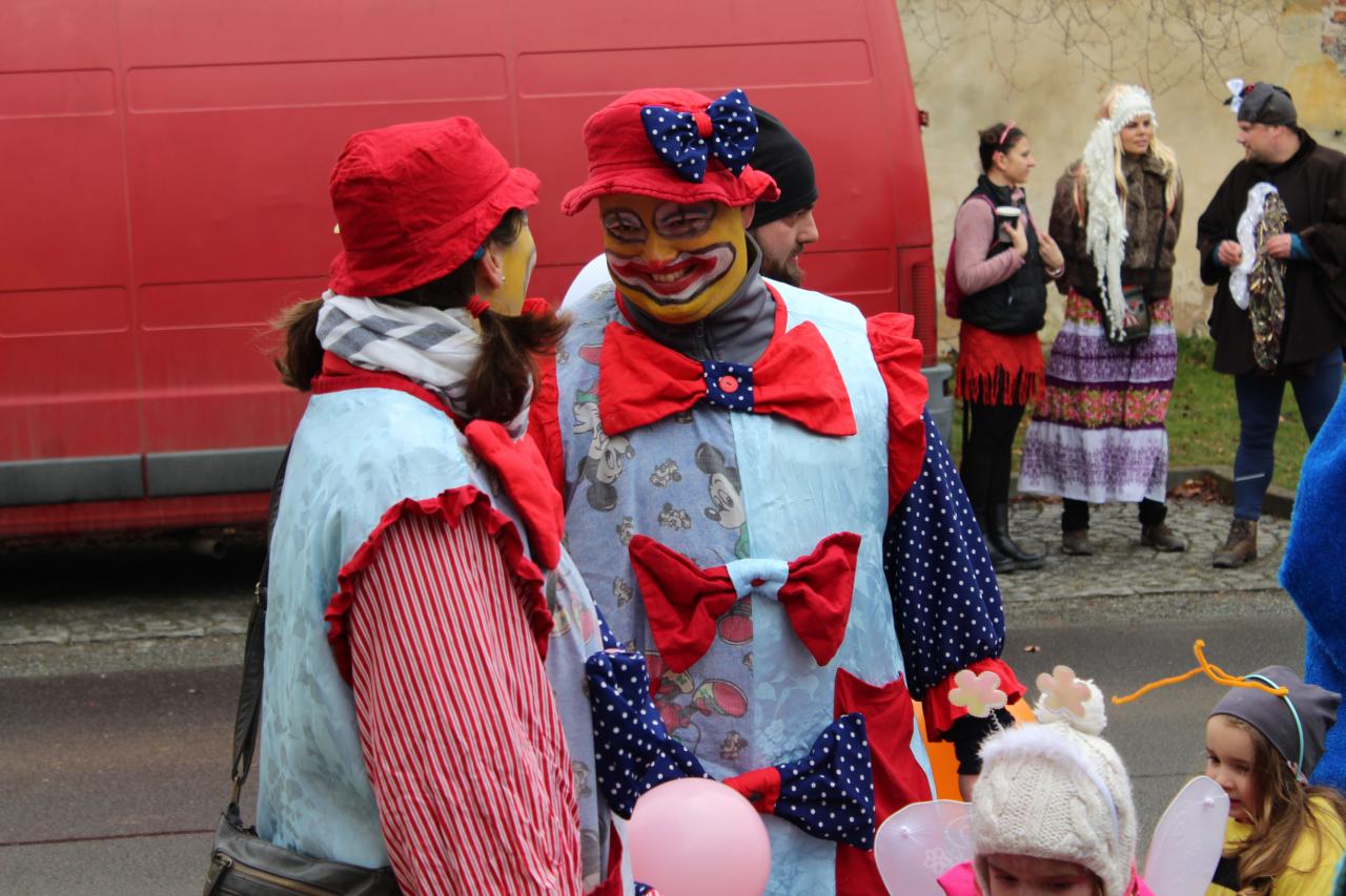 Vše bylo naplánováno, připraveno, zajištěno, bylo objednáno i pěkné počasí, tak do Lišic vyrazilo jen 7, slovy „sedm statečných“ a kapela. Ti nejvěrnější ze všech věrných! V Lišicích se naštěstí počet masek zdvojnásobil díky dominové společnosti Vlaďky Blahoutové. Po několika letech k nám zavítala i gorila. Prošli jsme Lišice, zazpívali si a autobusem odjeli do Lukavice. Předpokládali jsme obvyklý houf masek a špalír natěšených diváků. Ale běda přeběda, vyhlíželo nás asi deset věrných diváků a asi čtyři masky. To vyvedlo z míry nejen nás masky, ale i muzikanty, kteří jsou při svém putování a vyhrávání na ledacos zvyklí. Naštěstí se přitrousilo pár dalších masek a pan starosta, v masce rrrrádce půjčil krrrrrrrálovně starodávný klíč a mluvčí masek slíbila slušné a řádné chování všech masek. (To sice slibuje pokaždé. Ale letos to byla namouduši pravda! ) Pak si rrrádce a krrrálovna zatančili královské rreege, zatančil si s maskami i několika diváky a pak už se průvodeček pohnul směrem k Sokolovně, To nás bylo 20. Efektem sněhové koule masky přece jen přibyly, takže nakonec nás bylo asi 37. V průvodu šli král s královnou, klaunská rodinka, několik půvabných víl, čarodějnice a kouzelník, Domino, gorila, kostlivec, půvabná kočičí rodinka, pirát. pavouk a několik dalších zvířat a zvířátek: vosa, beruška, dvě ex-otické žáby, modrá a žlutá, které skrývaly dvě nejstarší účastnice průvodu ( a to služebně i věkově). Jelikož žáby hibernují, bylo nemožné po nich chtít skoky nebo dokonce hru na honěnou! Nejmladšímu účastníkovi, rozkošnému růžovému medvídkovi, bylo teprve 8 měsíců, bylo to ještě mládě! Na celý průvod dohlíželi dva členové VB a po zdravotní stránce se o nás staral šílený vědátor.